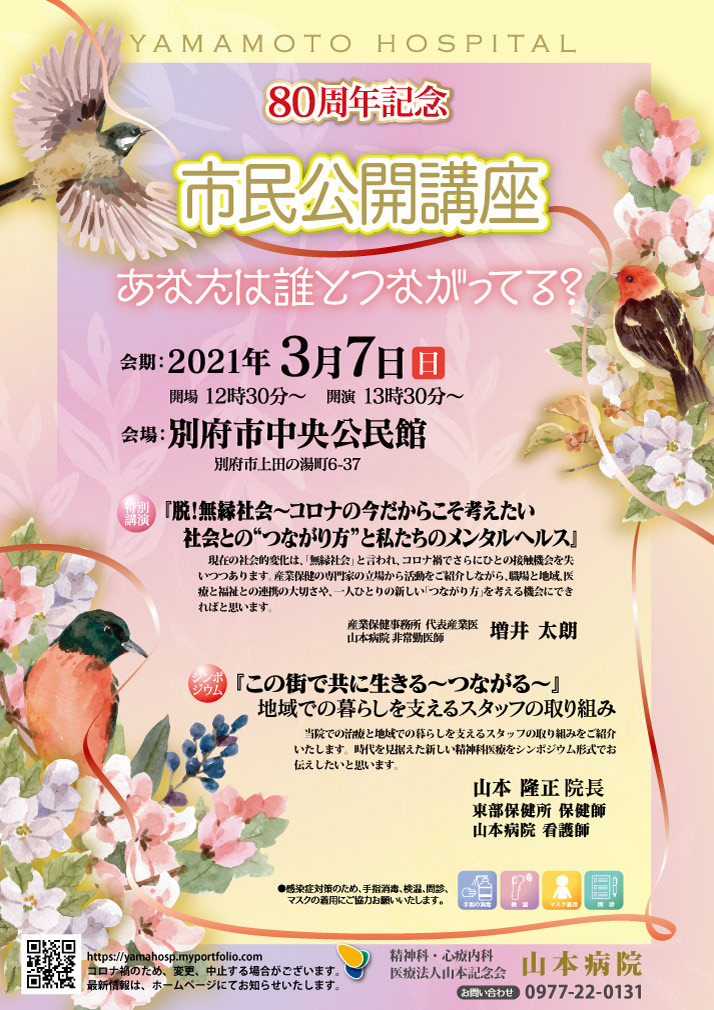 一般市民の皆様を対象にした市民公開講座を別府市公会堂(上田の湯町)にて行います。ご関心のある方は、どなたでもご参加いただけます。ソーシャルディスタンスを保つため、お座席を200席に制限しております。